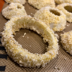 Shake excess egg mixture and evenly coat ring in panko and place on tin foil-lined cookie sheet sprayed with olive oil or a Silpat lined sheet. I prefer to use my Silpat mat. You can find them here.